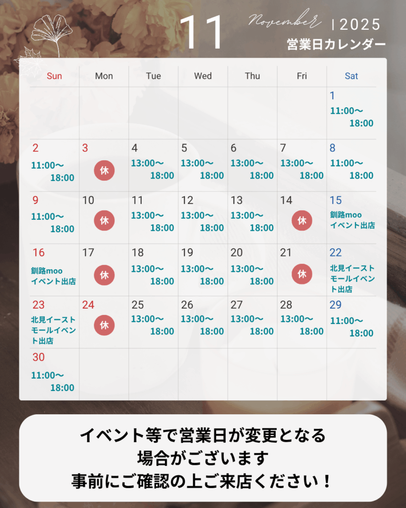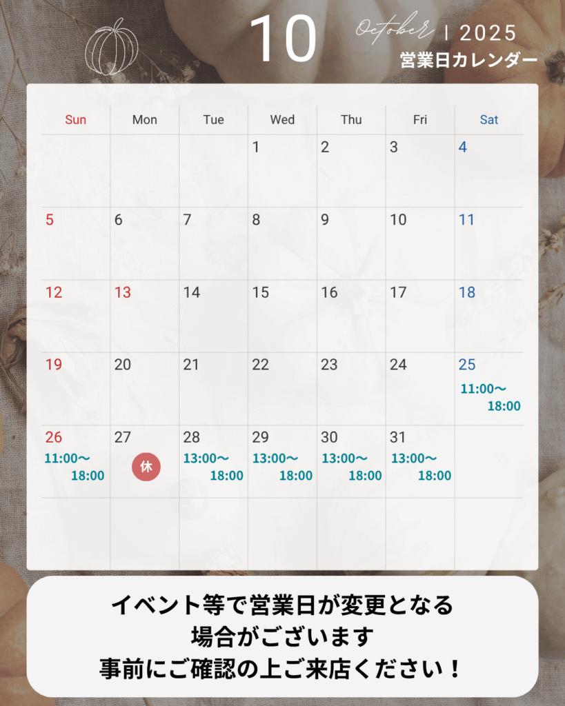 | 営業時間 | 平日:13:00〜18:00 土日:10:00〜18:00 |